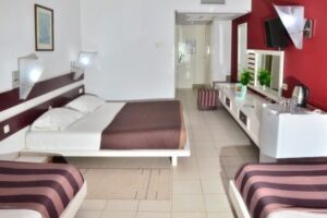 Ubytování v hotelu zahrnuje vkusně zařízené klimatizované pokoje s vlastním sociálním zařízením, minibarem, televizorem se satelitními programy, telefonem a balkonem nebo terasou. Dětská postýlka je k dispozici na vyžádání zdarma. Strava je zajištěna programem "All Inclusive", který zahrnuje snídaně, obědy, večeře formou bufetu, pozdní kontinentální snídaně, lehký odpolední snack a neomezené množství vybraných místních alkoholických a nealkoholických nápojů.