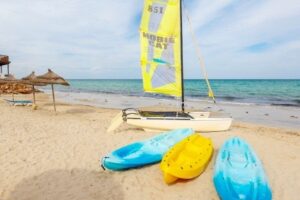 Na písečné pláži s pozvolným vstupem do moře mají hosté možnost využít různé vodní sporty (za poplatek) a mohou si pronajmout lehátka a slunečníky (za poplatek, osušky oproti záloze). Caribbean World Djerba nabízí skvělý pobyt na pobřeží Djerba s bohatými rekreačními a stravovacími možnostmi.