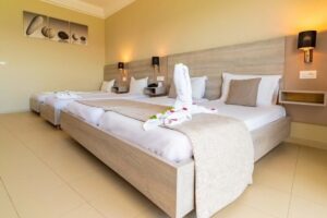 Ubytování zahrnuje jednoduše zařízené dvoulůžkové pokoje s možností až dvou přistýlek. Pokoje jsou vybaveny klimatizací, satelitní TV, telefonem, minibarem (na vyžádání) a balkonem nebo terasou. Za příplatek je možné ubytování s výhledem na moře. Dětská postýlka a vysoká jídelní židlička jsou k dispozici na vyžádání.